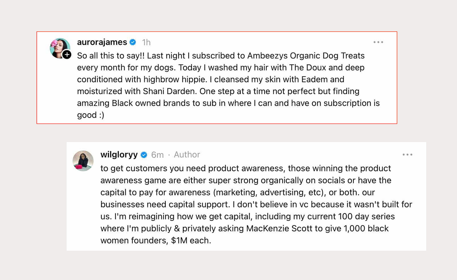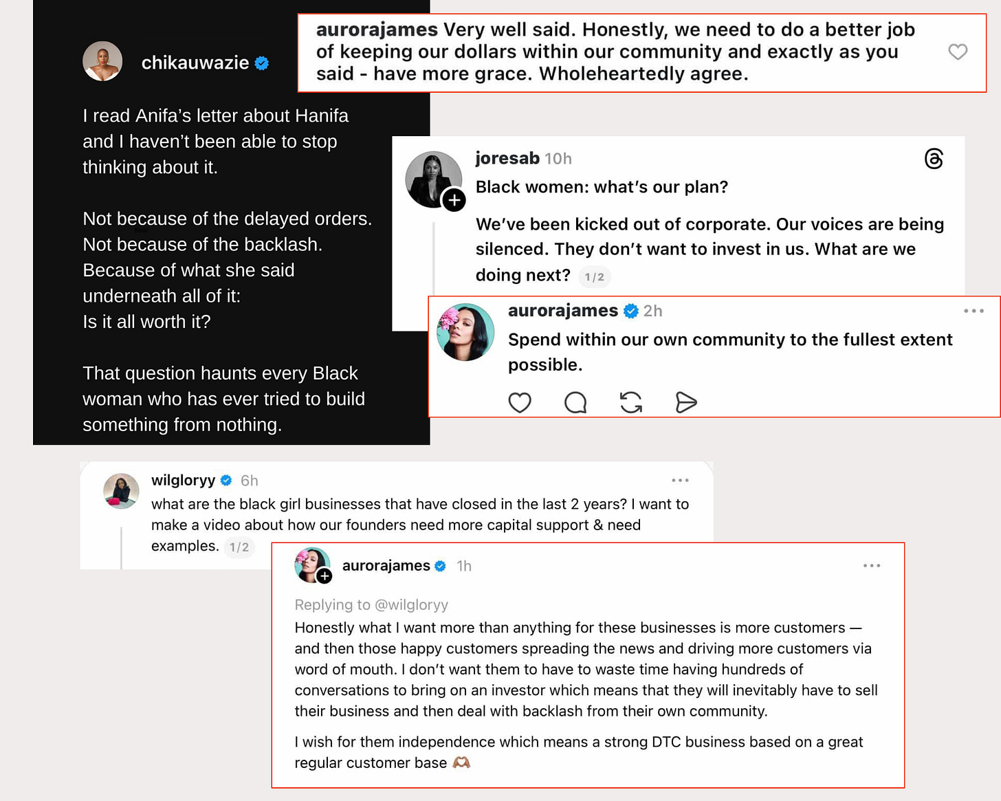 The woman who makes a business out of ‘championing’ Black businesses doesn't seem to think they need more funding. See for yourself. I do wonder if Aurora caught wind of the fact that we’re honking the horn on her, because she’s been unusually active in people's comment sections this week.