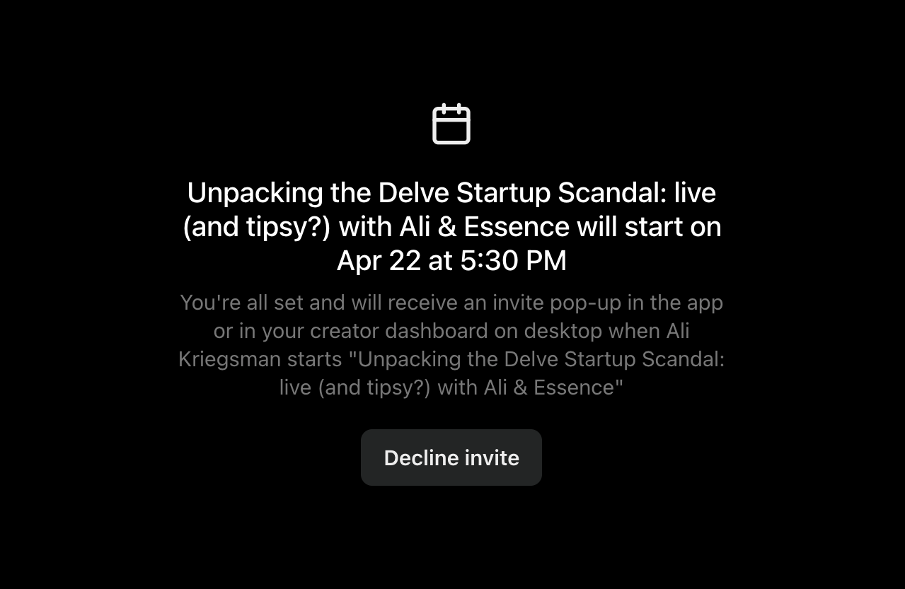 That’s all for today. Meet me and Ali Kriegsman tomorrow on here at 5:30p EST sharp so we can delve into the Delve scandal!