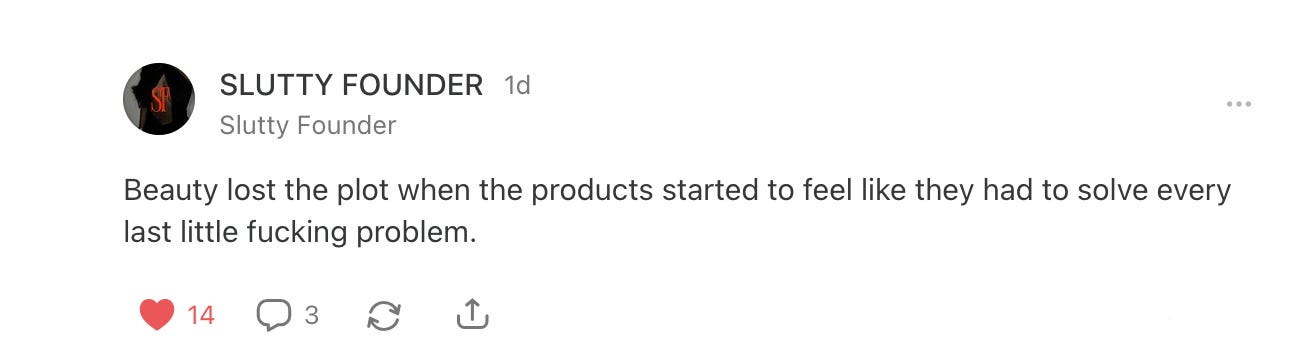 As I gently touched on last week, this brand will succeed as far as what Sephora and stakeholders are looking for, which is reach, and attention, and a ready-made audience 🤪. But I’m lowkey mortified (albeit not surprised) that Sephora has rewarded parasocial exploitation under the guise of young entrepreneurship. I liked the person I was before I discovered Jordan Matter’s Youtube account.